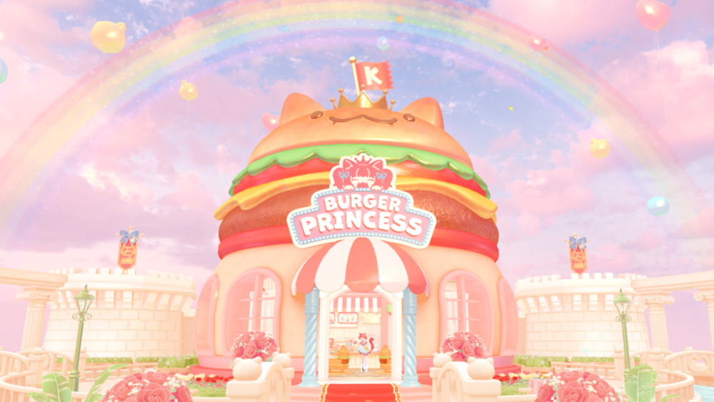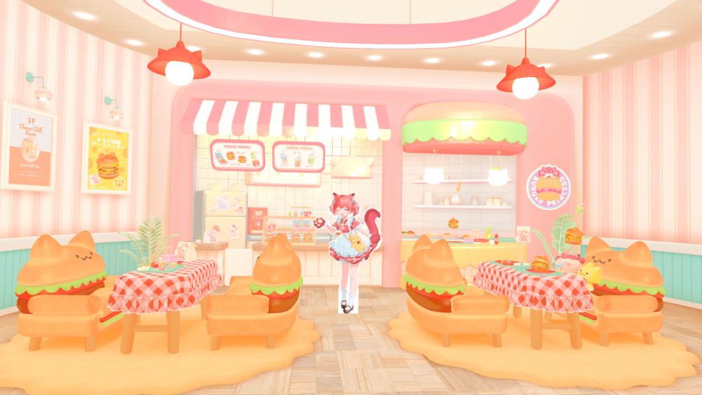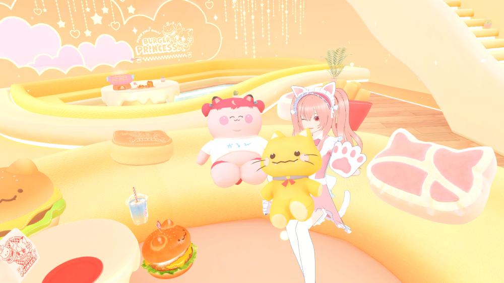 階段を上がるとまだ部屋があります。ハンバーガーと猫がモチーフのかわいらしいワールドで、食べ物が全体的に高カロリーな感じでした。ハンバーガー、ポテト、チーズフォンデュ・・・食べ物はイラスト風で可愛いのにテクスチャが綺麗でおいしそうなので深夜の飯テロでしたわ。