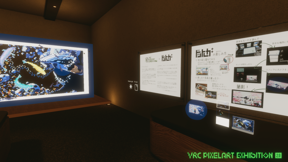 好きな背景やキャラクターを組み合わせて背景の後ろに立ち、青の球体の中にVRCのカメラを置くことで写真が撮れます。