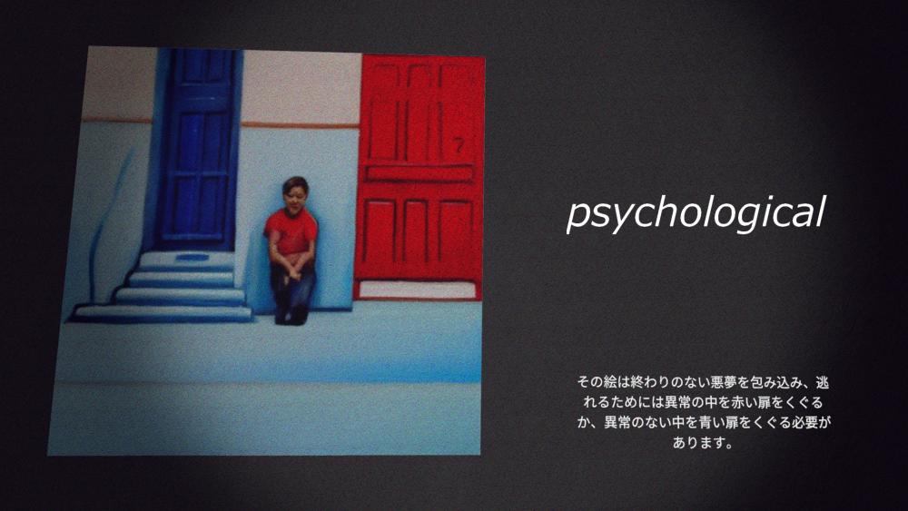青い扉と赤い扉の絵の横にJPのボタンがあります。日本語の説明を読んでみると、異変があれば赤い扉を、なければ青い扉を選べばいいというよくある8番出口風のホラーワールドですね。