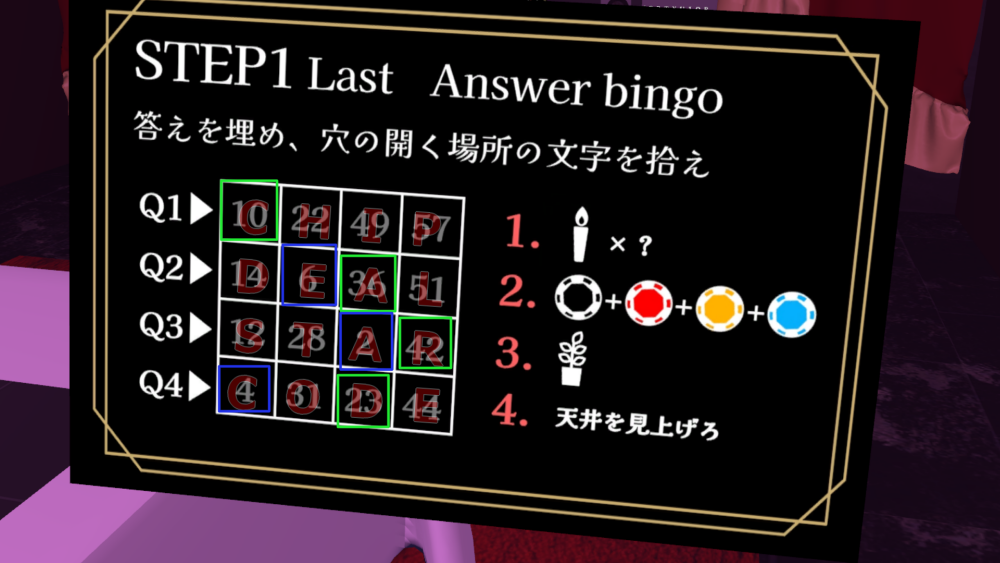 部屋にあるコインは黒が3,赤が8,黄色が9,青が16なので、そのままアルファベットの表を見ると答えは【CHIP】になりますね。
