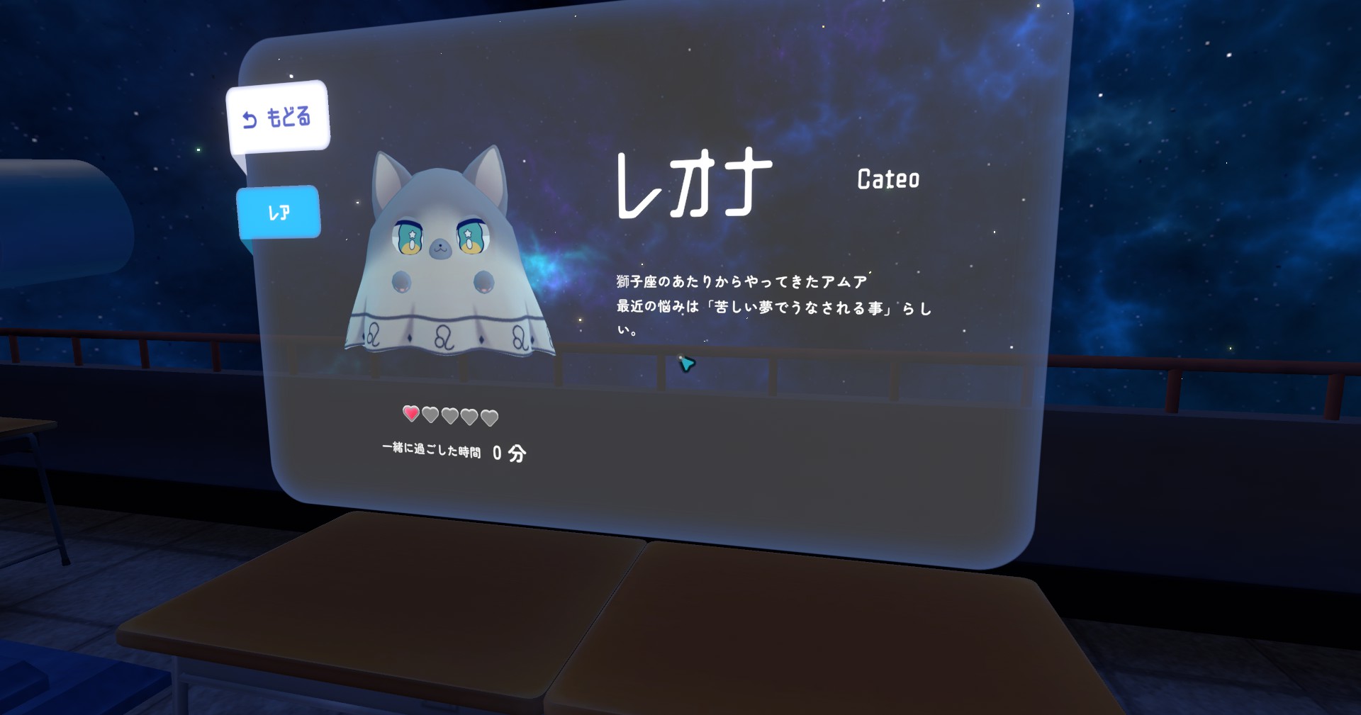 たまに流れ星や星座、惑星などが出てくるときがあります。本当に数秒しか現れないので見かけたらすぐに写真を撮ってみましょう。アムアにもレア度があり、ついてくる設定ができるのは1匹だけで、その子に設定したら前にいた子は消えてしまうみたいです。でも図鑑(幽霊手帳)には残っていました。アムアは手で掴むと鳴きますが、鳴き声がそれぞれ違っていて可愛いですよ。一緒に過ごす時間で好感度も変わるみたいですね。